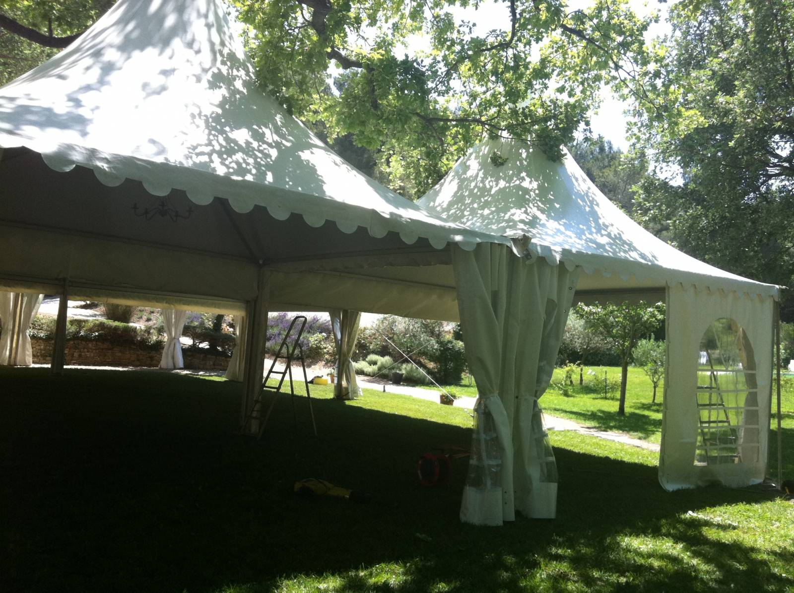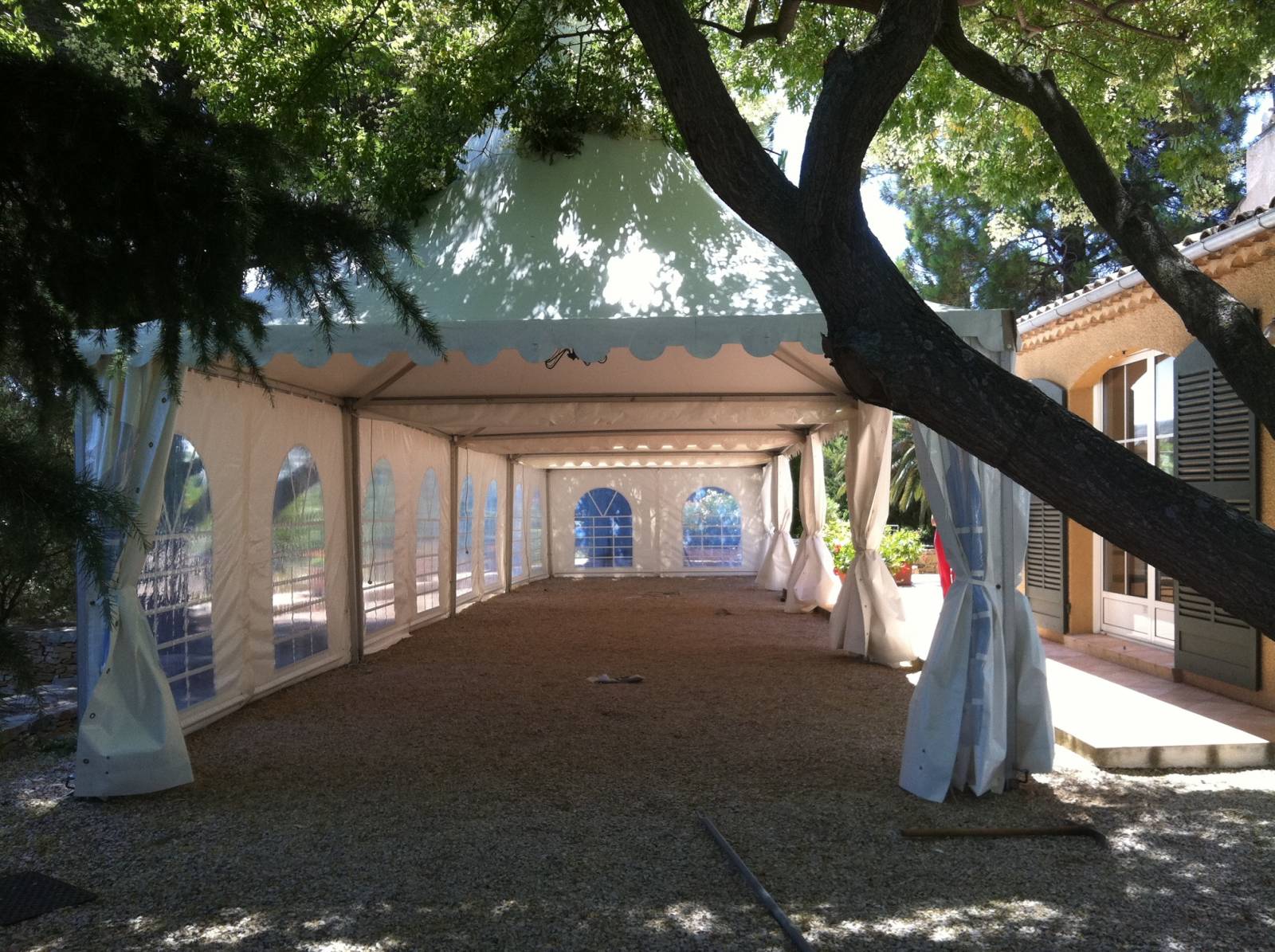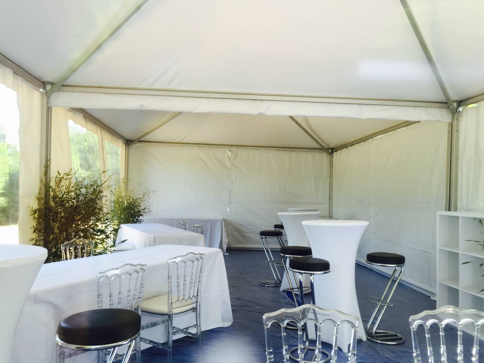 La jonction de ces tentes de réception permet de moduler différentes surfaces rectangulaires en L ou en carré. Voici un aperçu de l'intérieur de ces installations.